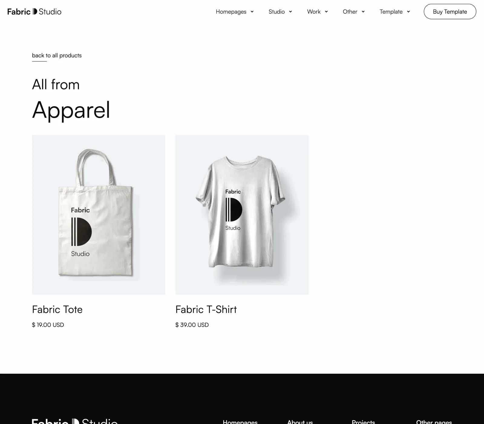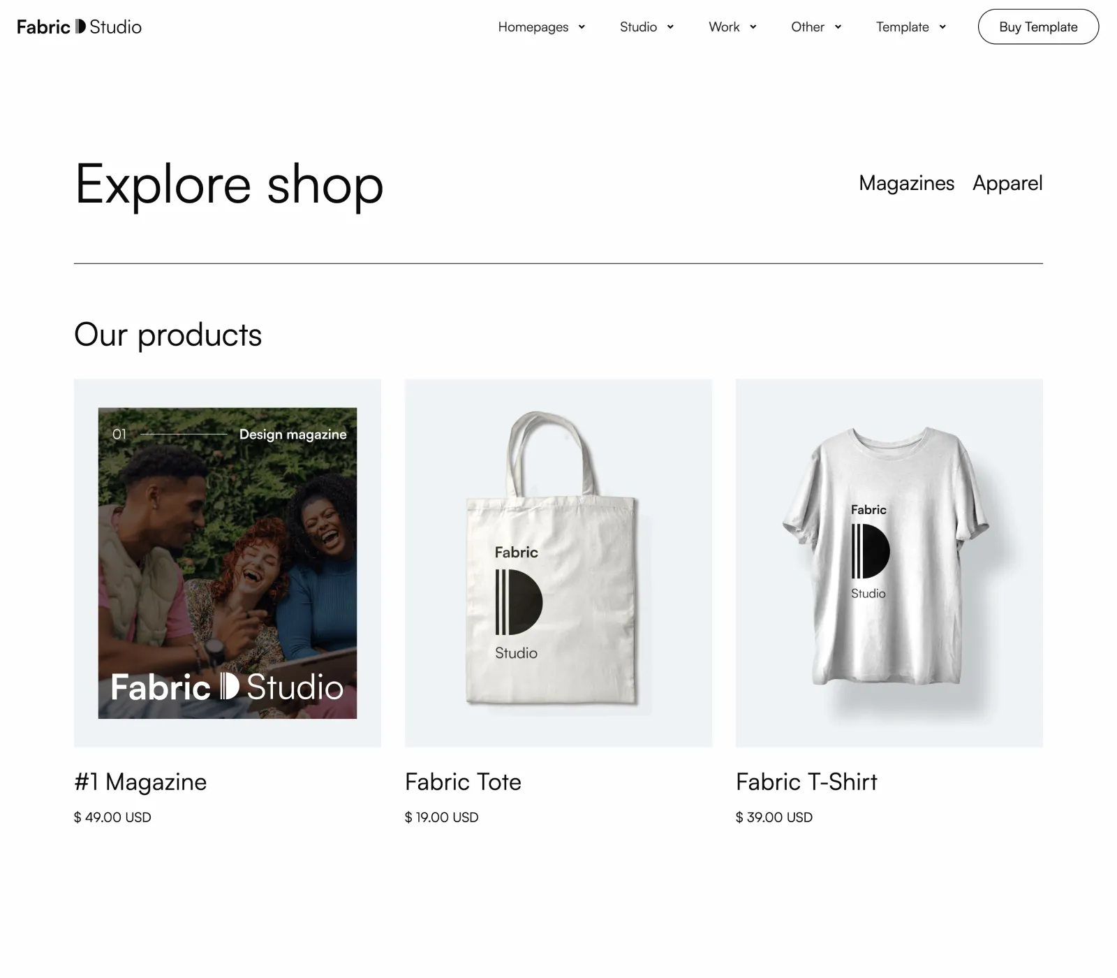 Fabric Studio Agency Template comes with eCommerce set up, so you can start selling your works straight away.